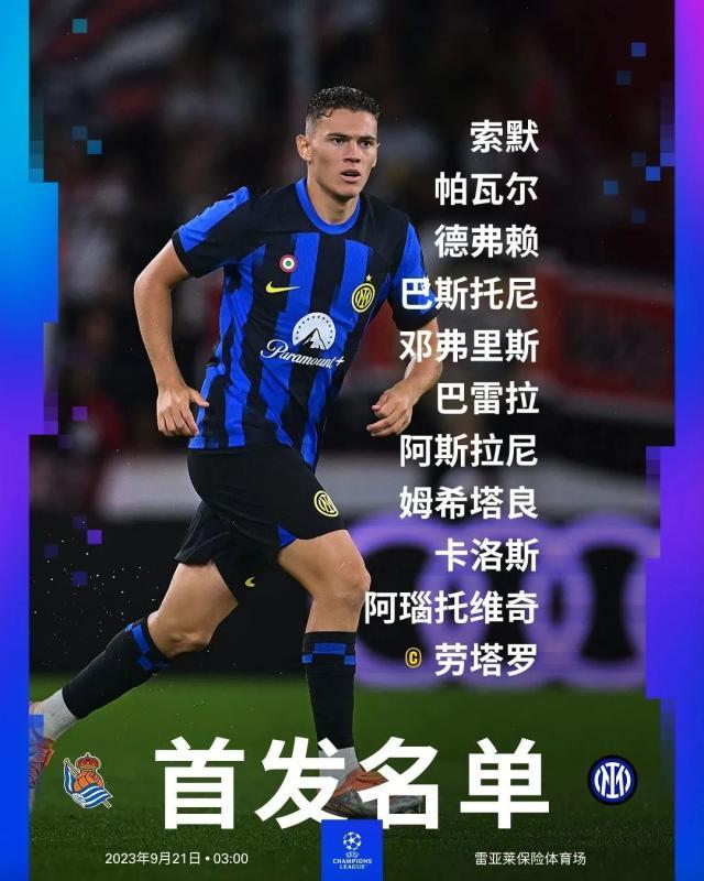 2023-24赛季欧冠D组第1轮,国际米兰客场对阵皇家社会。上半场皇家社会闪电破门,下半场劳塔罗扳平比分,最终国米客场1-1皇家社会。