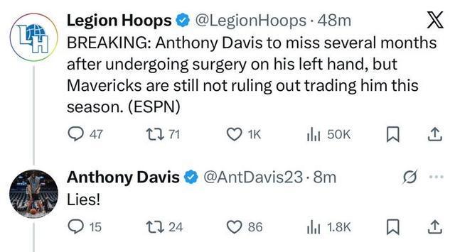 在消息发出后,浓眉第一时间更新个人社媒,他疑似驳斥了Shams的报道:“你们最好别再听信这些应用上的谣言了!”